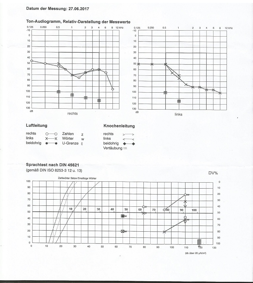 Jetzt kommen die neuen Messungen vom 28.6.17. Man kann hier als Vergleich der alten Daten Mitte 2011 sehen (auf der erste Seite oben). Nach 6 Jahren sind natürlich etwas verschlechtert. Diese Werte sind natürlich ohne Hörgeräte. Ich werde demnächst vom HNO-Arzt die Werte begutachten.