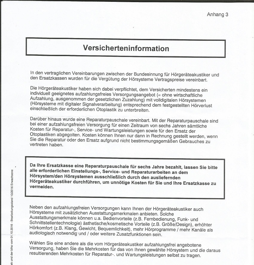 - Beim Ohrenarzt die Tauglichkeit der Geräte bestätigen lassen, damit der Akustiker auch sein Geld bekommt
