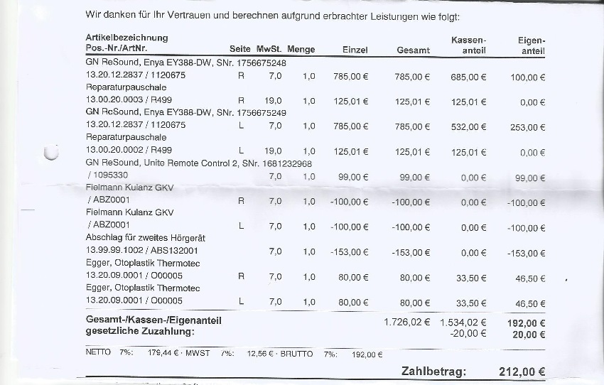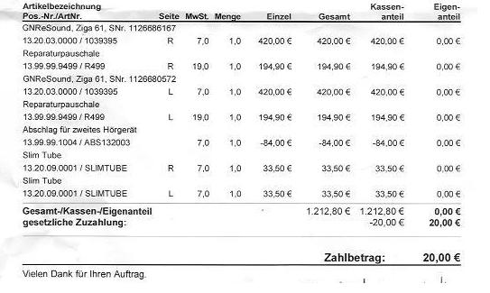 Was will man mehr? Mir reichte es, mir ging es im Prinzip nur um eine bessere Sprachverständlichkeit bei den Gruppen/Meetings, und irgendwelchen zusätzlichen Schnickschnack mit Induktionsschleife, Telefonanschluss und Funkübertragung brauche ich vorerst nicht. Dann vereinbarten wir den Kauf des Gerätes, der Akustiker erstellte eine detaillierte Rechnung, und ich blätterte die schlappen €20.- für beide Geräte als Zuzahlung hin. Ich konnte es immer noch nicht richtig fassen, von ursprünglich stolzen €4000.- auf bloße € 20.- "heruntergetestet". Der Akustiker 2 übergab mir dann noch zum Abschluss ein großes "Service-Päckchen", das nicht nur Batterien für 1 Jahr enthielt, sondern auch eine Trockenbox für die Nachtlagerung sowie verschiedene Reinigungsmittel. Hier muss man anerkennend sagen, dass dieses Päckchen sowie die Otoplastiken bei Akustiker 1 zusätzlich berechnet worden wären.