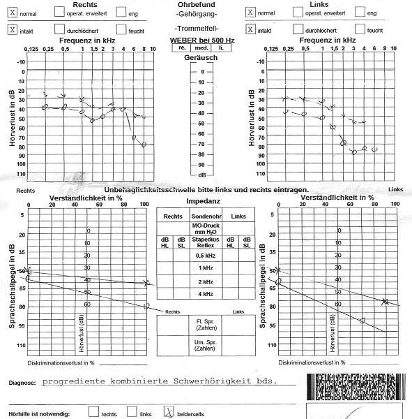 In den oberen beiden Diagrammen ist ersichtlich, dass ich mit dem rechten Ohr bis 4 kHz noch ganz gut höre, dann sackt es aber ab. Für die Erstellung der Diagramme werden über Kopfhörer einzelne Töne mit zunehmender Lautstärke erzeugt, wobei ich dann jeweils mit Handzeichen angeben musste, ab wann ich den Ton hören konnte. Auf dem linken Ohr geht es schon ab 1 kHz in den Keller. Die Sprachverständlichkeit wird mit Lautsprechern bei einem Sollpegel von 65 dB gemessen, wobei jeweils eine Reihe von einsilbigen Wörtern gesprochen wird. Bei diesem Pegel war meine Sprachverständlichkeit rechts 32 %, links nur 10 % im Vergleich zu einem guten Gehör. Das war dann doch schon ganz schön heftig wenig.