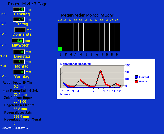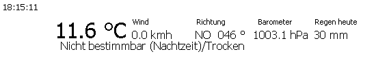 ACHTUNG: Die angezeigten Daten sind hier nicht immer aktuell und zuverlässig, da der dazugehörige Rechner nur zeitweise in Betrieb ist. Schauen Sie zuerst auf das Datum der schwarzen Zeile. Um verlässliche aktuelle Daten der näheren Umgegend einzusehen, können Sie den aktuellen Wetterbericht des Siebengebirges rund um die Uhr von der Wetterstation DB0DBN-6 / Ölberg abrufen, die ca. 2 km südlich und 260 m höher gelegen ist. Die Temperaturen in Thomasberg sind in der Regel ca. 2 - 3 Grad höher als auf dem Ölberg, in Königswinter Altstadt ca. 3-4 Grad höher.