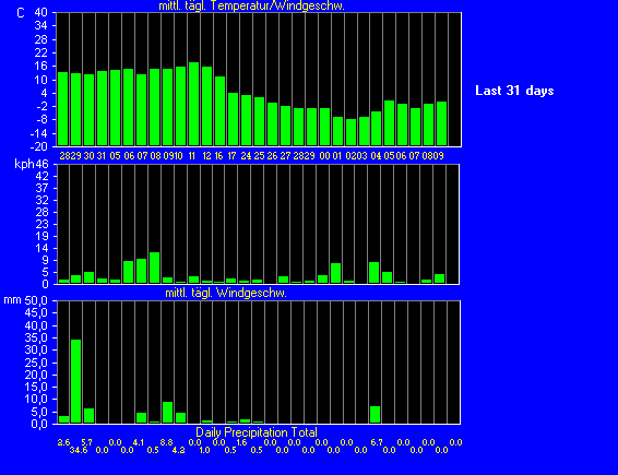 Temperatur, Wind und Regen während der letzten 31 Tage